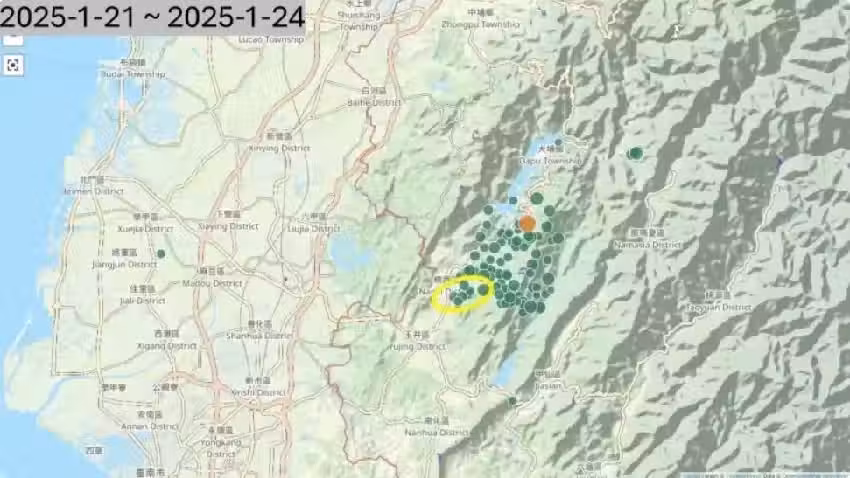 ▲0121嘉義大埔6.4地震後,截至1月25日晚間9時26分為止,已發生103起餘震。