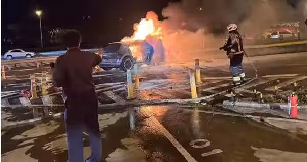 但在行經楊梅休息站時,突然自撞護欄,隨即爆出熊熊火勢。
