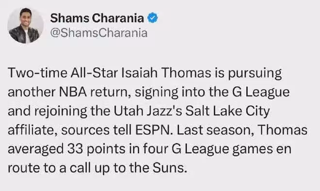 Shams:小托馬斯簽約爵士發展聯盟球隊鹽湖城星隊,以此尋求重返NBA的機會。