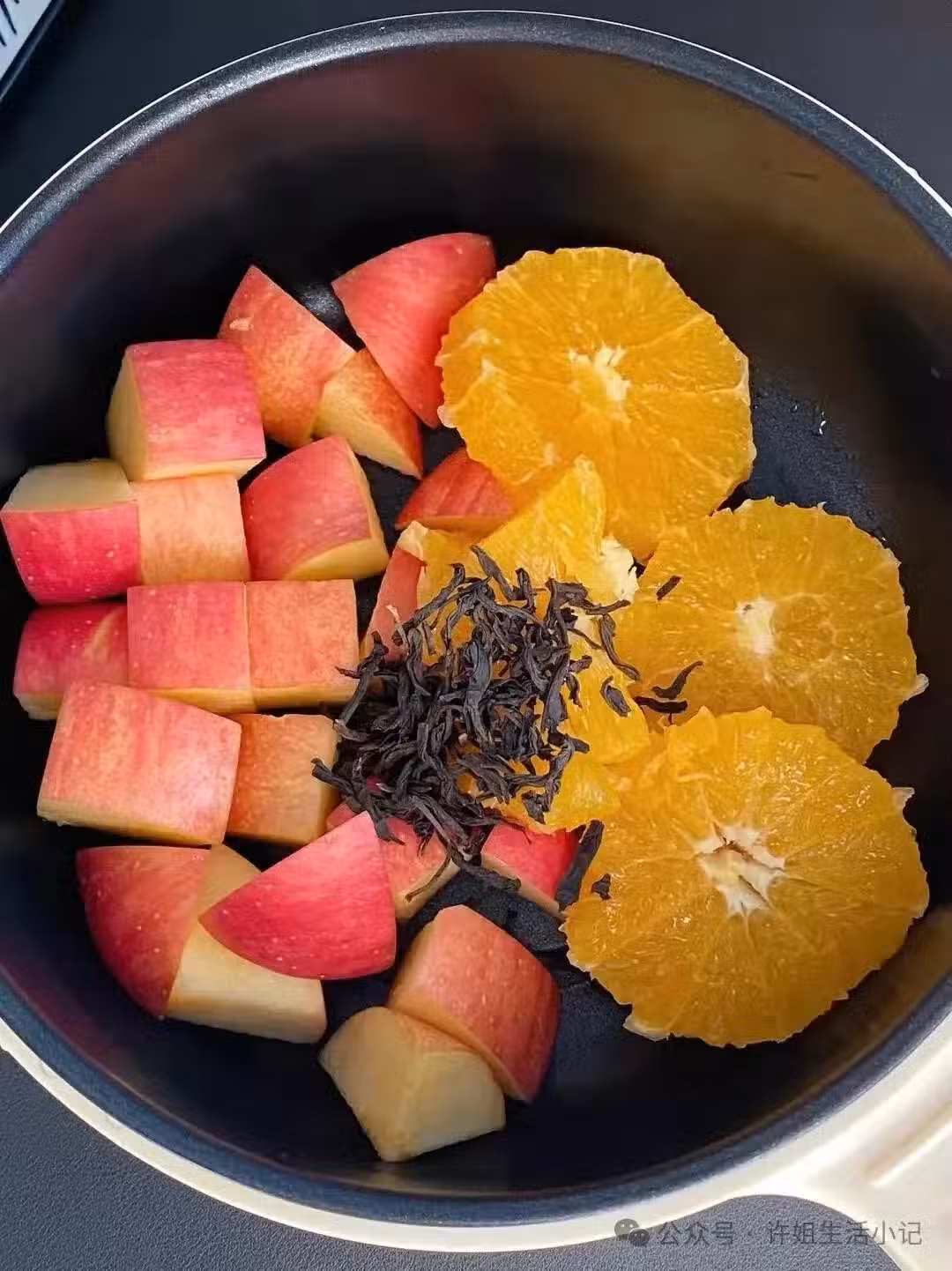 2️⃣將蘋果塊,橙子片、紅茶放入鍋中,兌入適量清水,小火慢煮,煮熟後搗碎橙子肉,盛出即可。