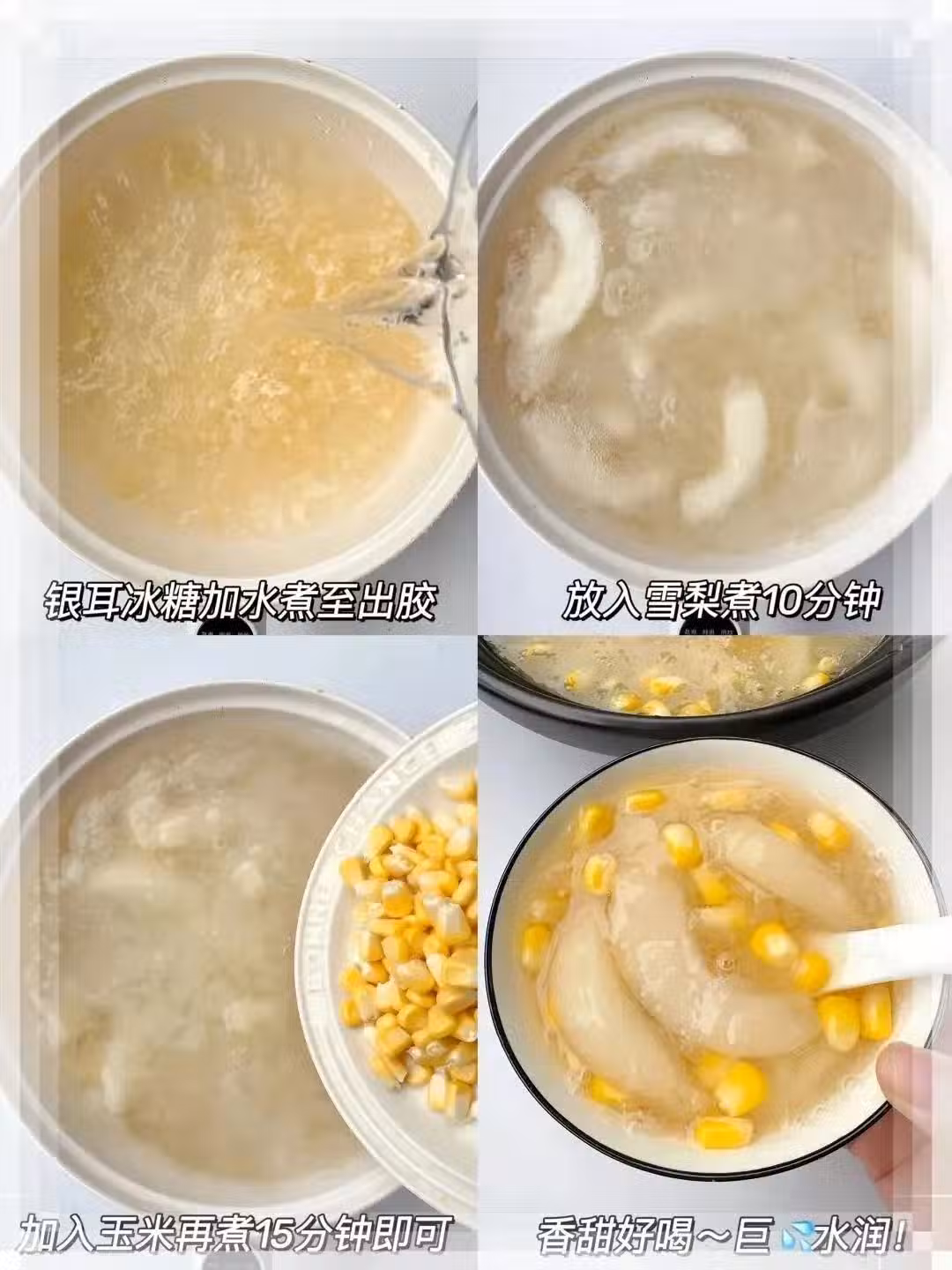接著加入玉米粒,攪拌均勻,繼續煮 15 分鐘。玉米的香甜會與銀耳、雪梨完美融合,同時玉米粒也會熟透,口感鮮嫩多汁。