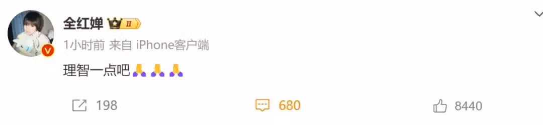 1月29日(大年初一),全紅嬋在社交平台發文呼籲:「理智一點吧。」