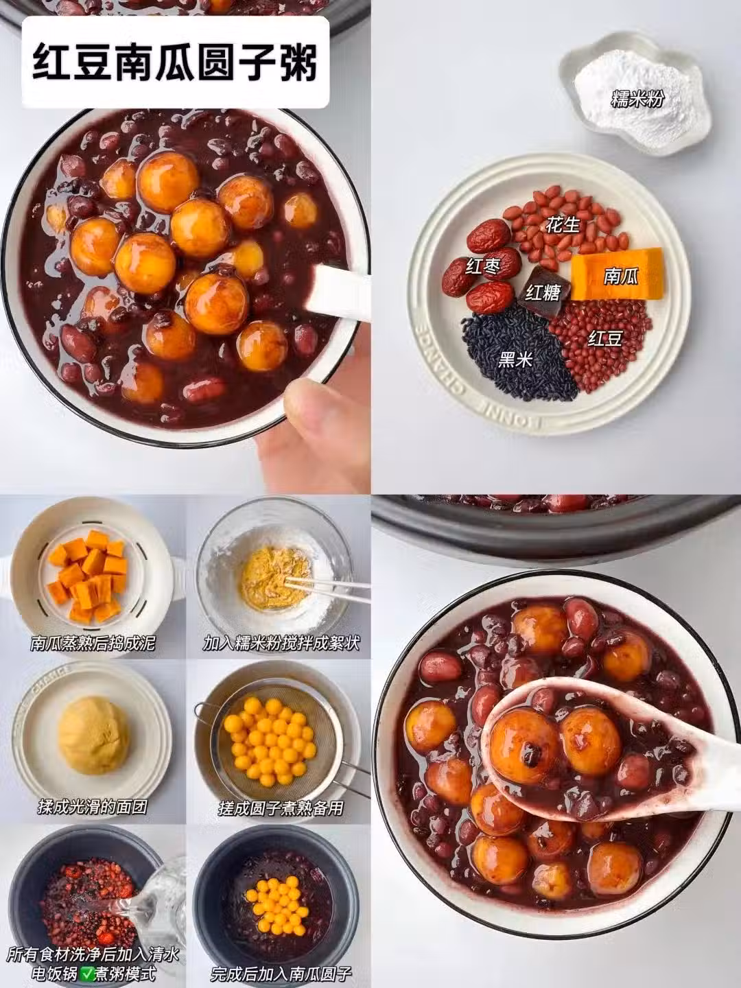 紅豆黑米提前浸泡2小時,和其他食材一起放入電飯鍋中,加清水煮成粥,煮好後加入南瓜圓子就可以吃啦~