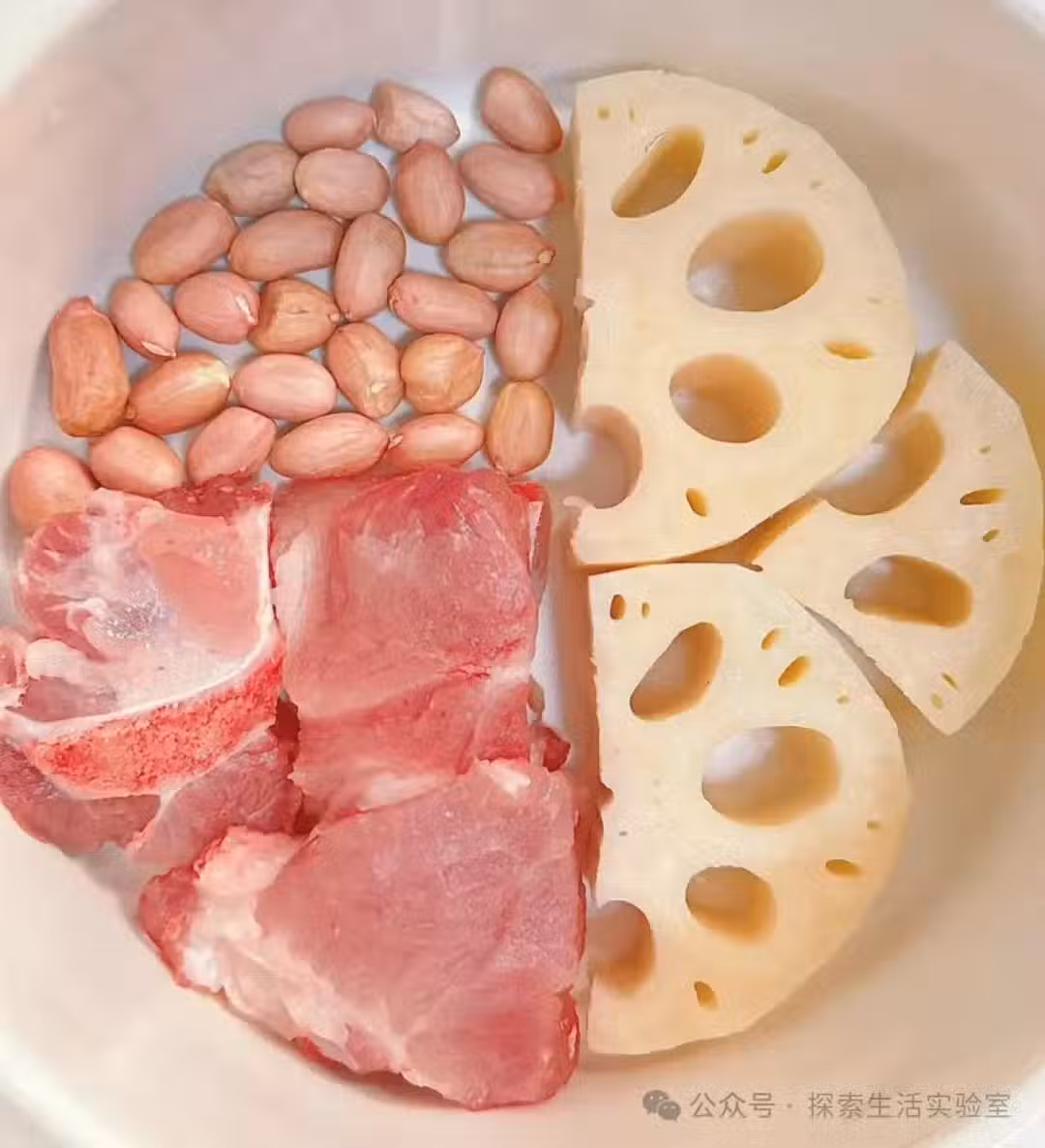 ③將花生、蓮藕、排骨放進鍋里,加入適量開水,燉鍋開燉湯模式,燉煮2小時左右,出鍋前放鹽就可以啦~