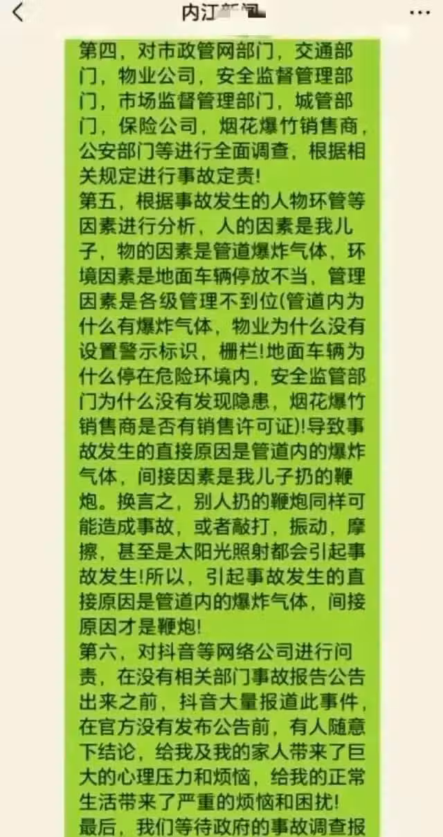 實際上,在小孩哥的這個「大炮仗」炸開後,就有網友表示在這件事情上小孩哥雖然有錯,卻不應該負全責。理由跟小孩哥母親聲明中所列舉的差不多,比如:市政部門沒有對下水管道進行常態化的清理,裡面沼氣濃度過高,才導致遇到鞭炮就爆炸;事發地點並非停車場卻停放了這麼多車輛,物業公司和交通部門管理不規範;等等。