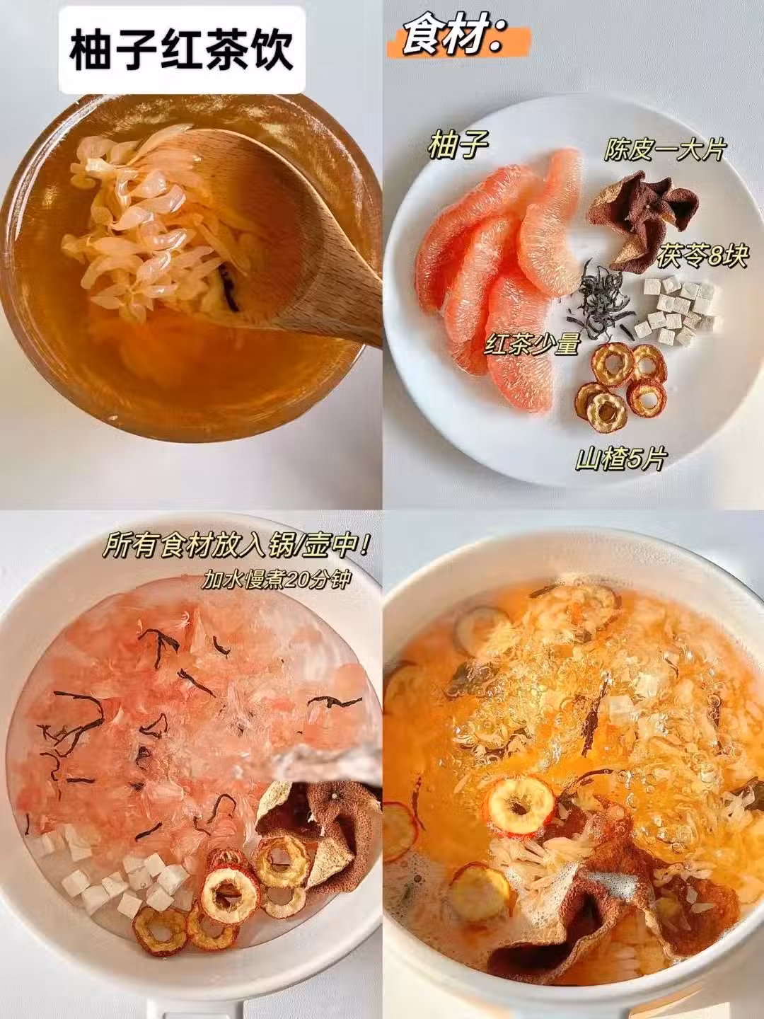 紅柚果肉4瓣、陳皮一大片、山楂5片、茯苓8顆、冰糖適量、紅茶2g