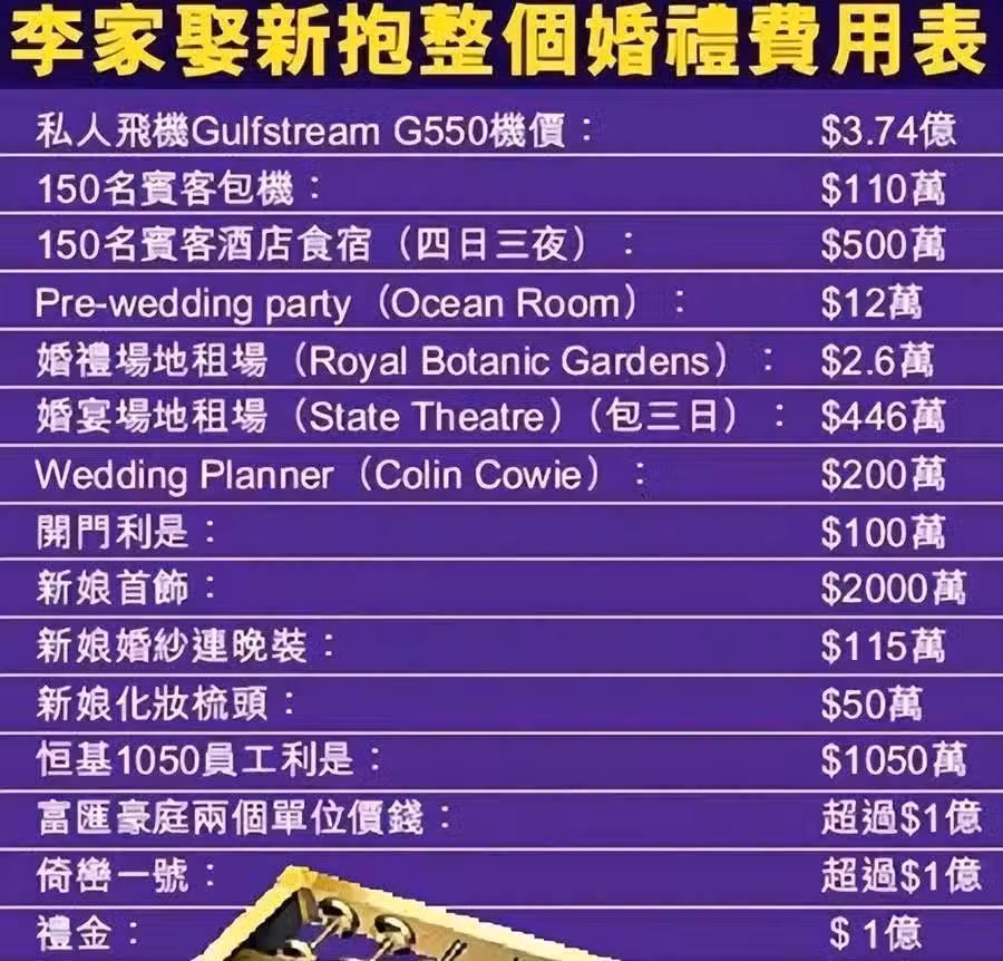 除此之外,李家還贈送新娘首飾價值2000萬(台幣約8955萬)(因為過於奢侈,不適合日常佩戴)、房產1億(台幣約4.4億)、私人飛機3.74億(台幣約16億)等等用來祝賀新人新婚。
