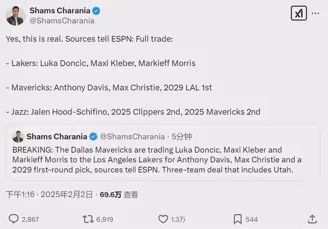 這是不是假消息啊?很多球迷甚至懷疑Shams被盜號了!尼克斯球員布倫森寫道:「這是愚人節嗎?」沒錯,這筆交易確實發生了,教主也沒想到。湖人在給詹姆斯找接班人,東契奇顯然是最佳人選。但獨行俠不缺內線,為啥非要濃眉?
