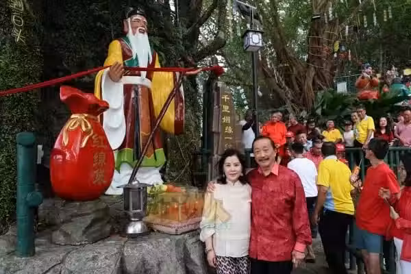 恩愛的陳志遠伉儷在蜈蚣山天師宮的月老神像下拍照留念。