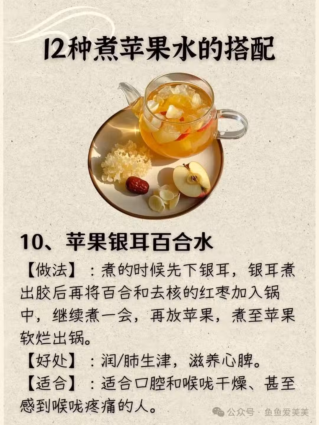 十一、蘋果銀耳紅棗蓮子水 做法:銀耳和蓮子先煮至軟爛,再加入切好的蘋果和去核紅棗,燉煮半小時。 好處:滋陰潤肺,養心安神。 適合:易感到疲乏、睡眠質量差的人群。