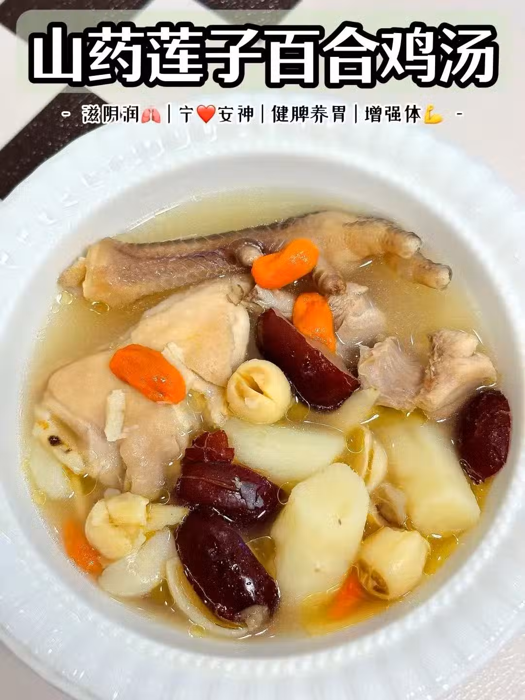 食材:雞半隻、山藥1根、蓮子30g、百合25g、紅棗6個、枸杞適量、薑片3片。