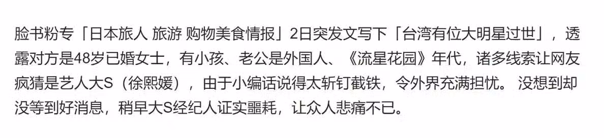 從這則爆料來推斷,大S是2號早晨去世的消息,基本可以對得上。