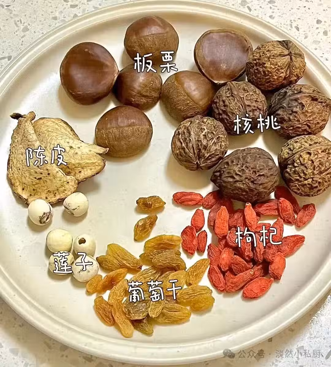 食材:栗子、核桃、蓮子各6個,葡萄乾、枸杞,適量,陳皮一片 做法: 1、栗子、核桃剝去外殼,留下內皮,切成兩半。 2、所有食材一起煮40分鐘。 3、撈出栗子內皮,加紅糖調味。 栗子有著很好地強壯筋骨的功效,因為從中醫食療的角度而言栗子入腎經,對於一些腎經虛弱,所導致的腰膝酸軟、腰腿疼、耳鳴、四肢無力。 如果適當地食用一些栗子,通過其滋補腎經的作用,而發揮出強壯筋骨、緩解上述症狀的功效。 核桃味甘,性溫,歸腎、肺、大腸經。它可以補腎、固精強腰、潤肺定喘、潤腸通便。 對於久病、產後或老年體虛者,蓮子更是常用營養佳品;蓮子鹼有平抑性慾的作用,對於青年人夢多,遺精頻繁或滑精者,服食蓮子有良好的止遺澀精作用。 枸杞有提高機體免疫力的作用,可以補氣強精、滋補肝腎、抗衰老、止消渴、暖身體、抗腫瘤。 葡萄乾含有多種礦物質和維生素、胺基酸,常食對神經衰弱和過度疲勞者有較好的補益作用,還是婦女病的食療佳品。