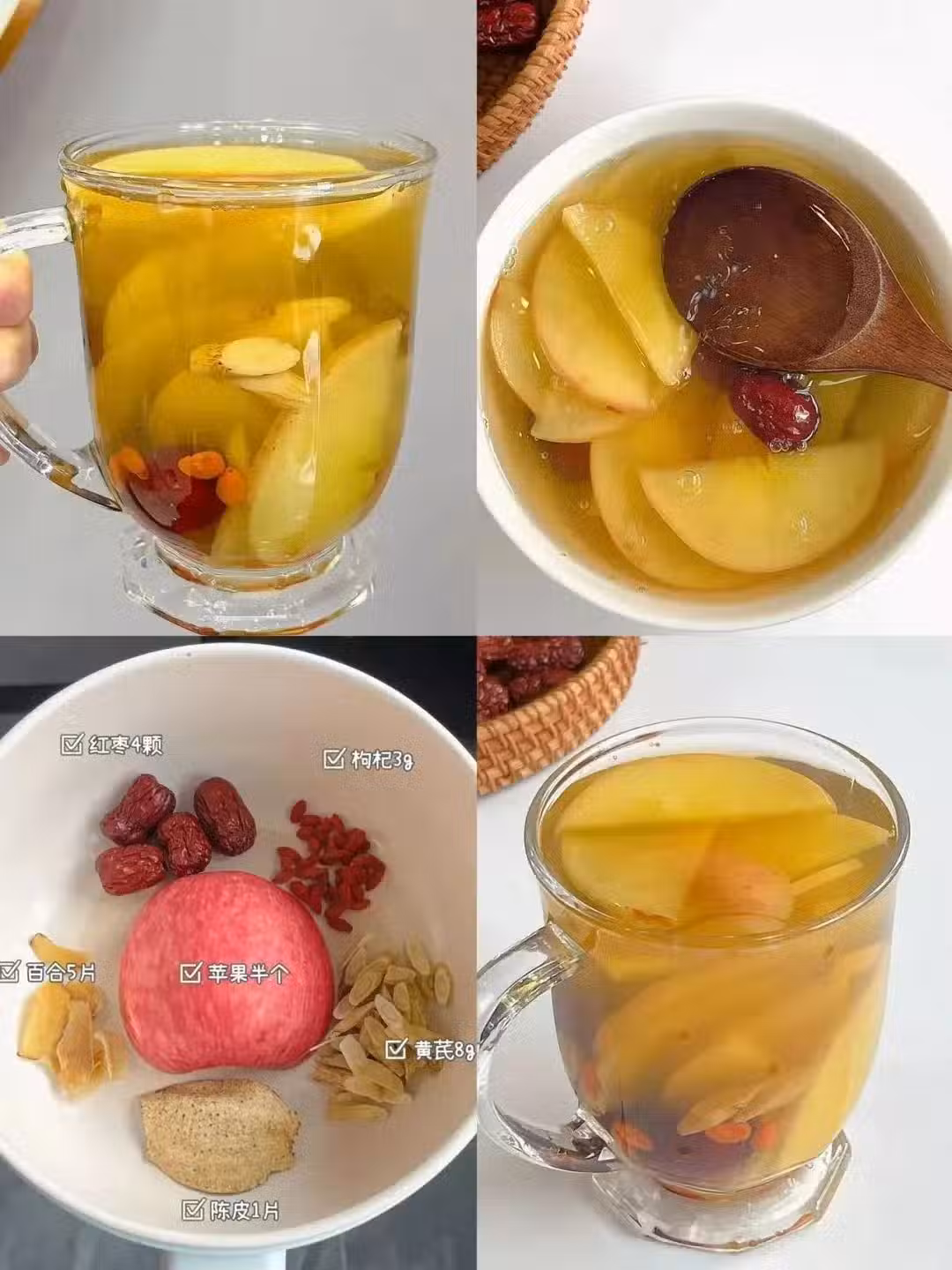 ③蘋果無花果玫瑰花茶:總是熬夜上火,失眠多夢,面色暗淡,情緒不佳的姐妹,可以試試這個蘋果無花果玫瑰花茶,味道香甜好喝,玫瑰花清香特別好喝,不僅可以補氣補血,美容養顏,調節身體,還可以舒緩心情,改善睡眠質量,很適合熬夜上火,失眠多夢,面色暗淡,情緒不好的姐妹多喝~