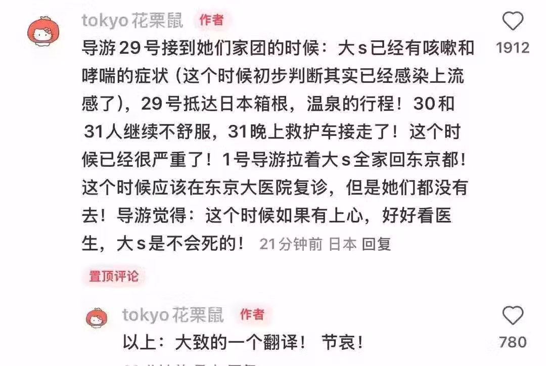 還有網友表示在29號大S犯病後,家裡人好像也沒特別重視,當天還在繼續溫泉行程,30號和31號人也不舒服,到31號晚上再度被救護車拉走,這個時候病情已經十分嚴重了。1號時導遊拉著一家人回東京,這個時候其實還應該去東京的大醫院複診,但他們全家人都沒有重視這個事情。導遊是認為,如果在最後關鍵時刻家裡人上點心,大S或許還有一線生機,還不至於發展到這麼嚴重的地步。