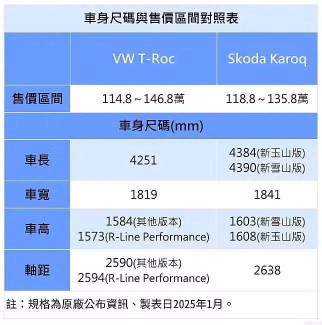 Karoq僅供單一1.5升動力、兩等級,而T-Roc提供1.5/2.0升兩種動力,劃分三車型,因此售價區間分布較廣,也能觸及較多客群,但若是同以1.5升動力來對比,Karoq售價就比T-Roc稍貴一點。兩車系出同源,皆採用集團MQB模組化平台打造,定位都是小型SUV,不過尺碼數據都由Karoq小幅勝出、甚至軸距還多了40mm以上。