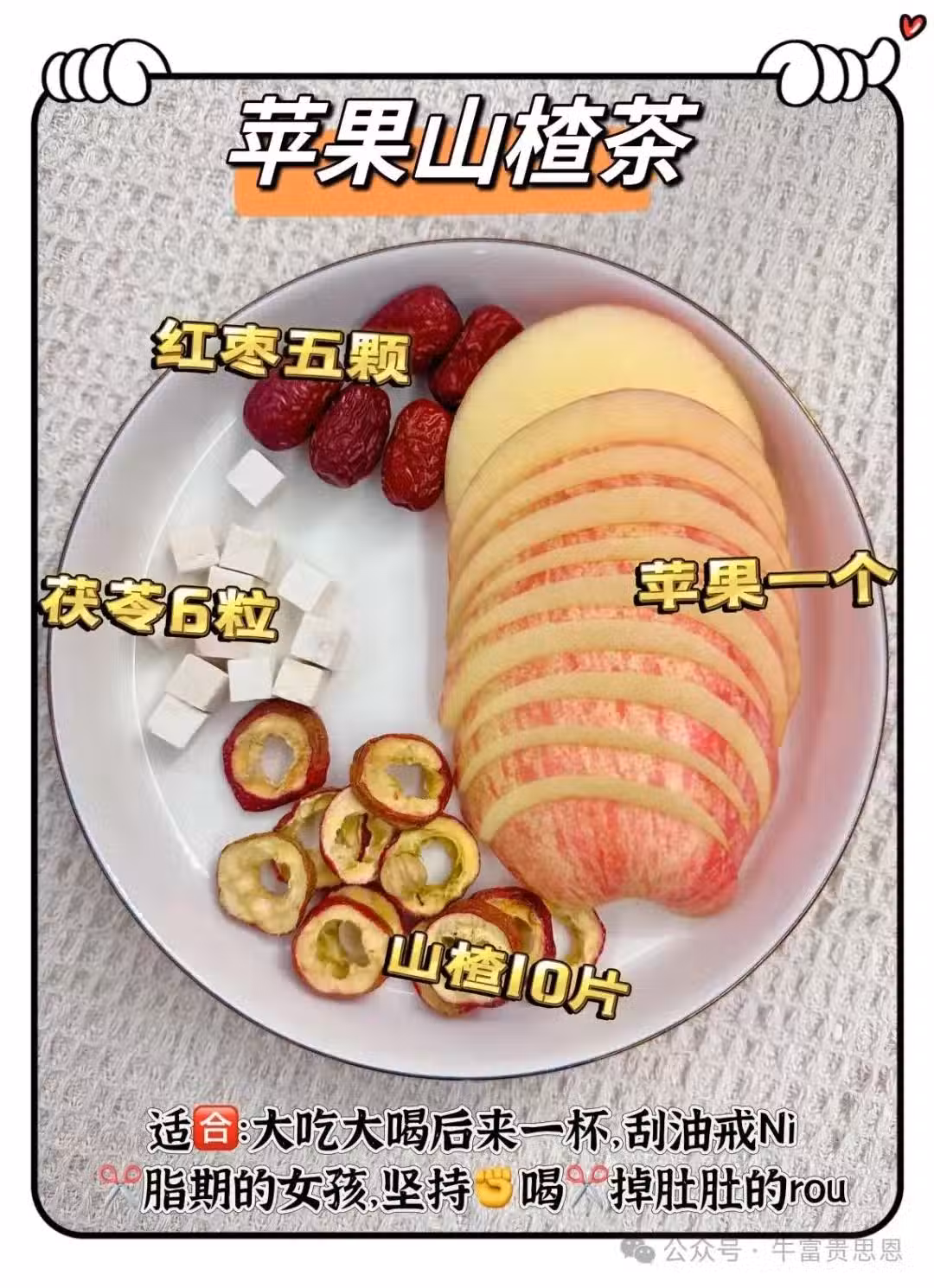 蘋果富含維生素與膳食纖維,口感香甜;山楂具有獨特的酸甜味,能促進消化;紅棗可補氣養血;茯苓則是常見的中藥材,能健脾祛濕。