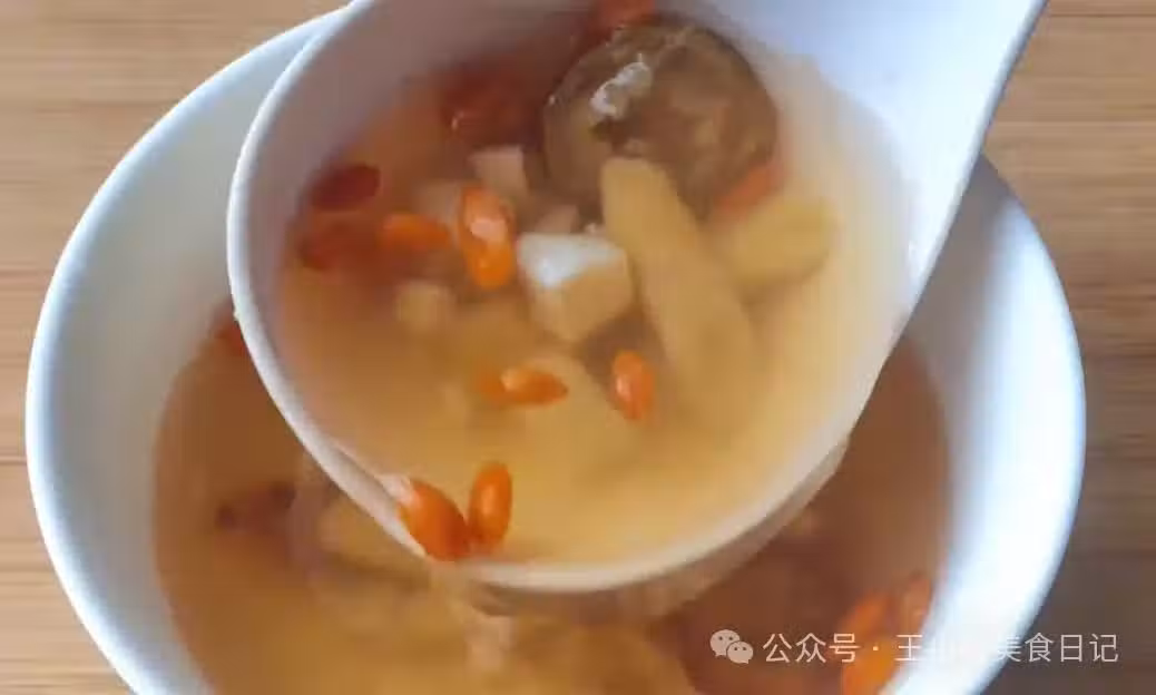 6.最後調味與出鍋:繼續用小火煮1分鐘,讓枸杞的營養成分充分融入湯中。隨後,即可關火出鍋。將煮好的茯苓黃芪山楂湯倒入碗中,稍稍放涼後即可享用。湯中融合了黃芪的香氣、茯苓的淡雅以及山楂的酸甜,口感層次豐富,令人回味無窮。