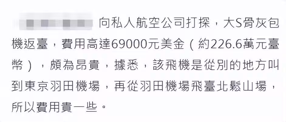 據悉,大S骨灰在5日下午坐私人包機回家,家人不設靈堂,直接帶骨灰回家安置,數個小時之後,汪小菲開1680萬台幣的豪車抵達大S的家,與此同時,某大陸網友聲稱是汪小菲出錢包機,而汪小菲母親推薦及點贊此視訊,讓網友誤以為是汪小菲包機。