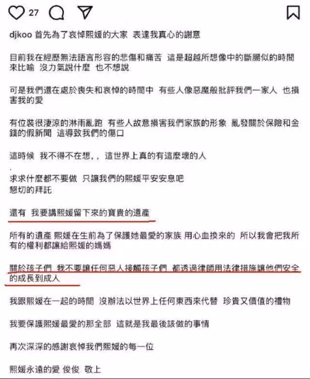 說會把自己的權利讓給丈母娘,還表示會守護大S的倆孩子,並通過法律措施讓他們安全成長到成年,不會讓任何壞人搶走。