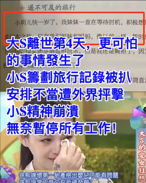 大S離世第4天,更可怕的事情發生了,小S籌劃旅行記錄被扒,安排不當遭外界抨擊,小S精神崩潰,無奈暫停所有工作!