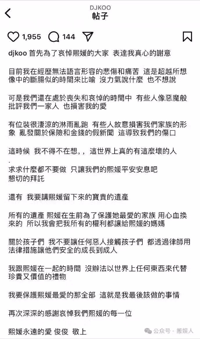 可即便全家沉浸在哀傷與悼念時,仍有人如惡魔般詆毀他們,玷污他對大 S 的深情。