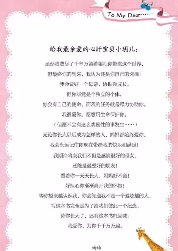 她坦言自己並不是個愛炫耀的人,寫下這些文字完全是為了留下與女兒共同的記憶,「期待你長大了,還有這本書能回味,我愛你,為你千千萬萬遍。」