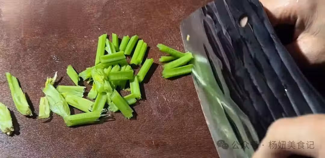 7、切芹菜段 芹菜味道清香,富含膳食纖維,熱量低,是減肥人士的福音。用刀背拍打芹菜根部,更容易釋放香味。切成4-5厘米長的小段。