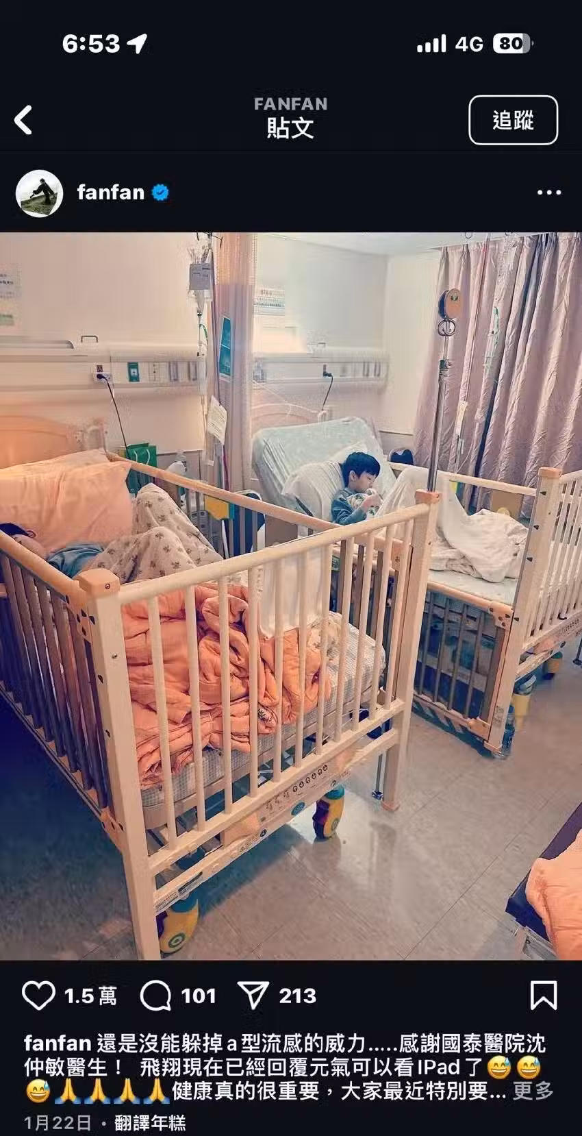 ▲范瑋琪1月22日發文,透露雙胞胎兒子得A流住院,「一家人都病懨懨的」。