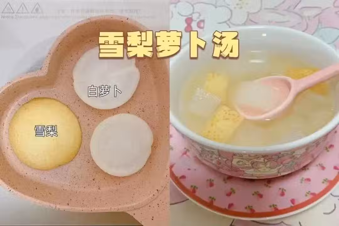 白蘿蔔性涼,雪梨又是潤燥的好手,這一對搭配特別適合熱咳、乾咳的人群。但體質偏寒的人,建議不要空腹喝哦!可以在湯里加一兩片薑片中和一下。