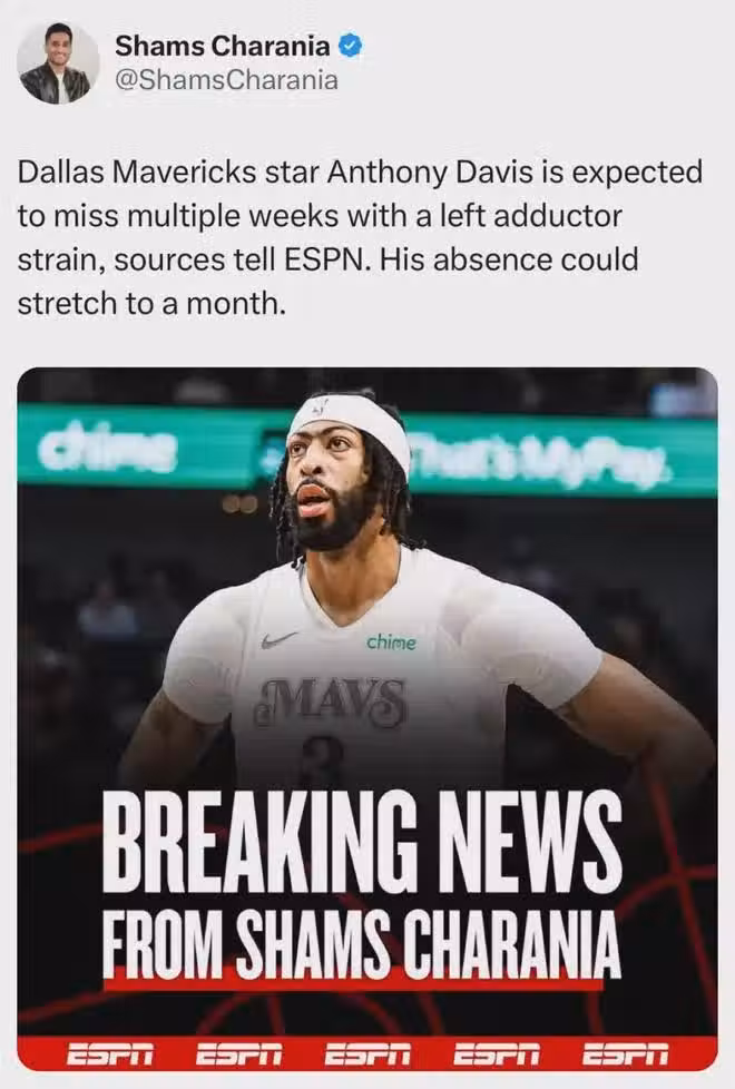 Shams:濃眉哥因左內收肌拉傷缺席數周,也可能延長至一個月。