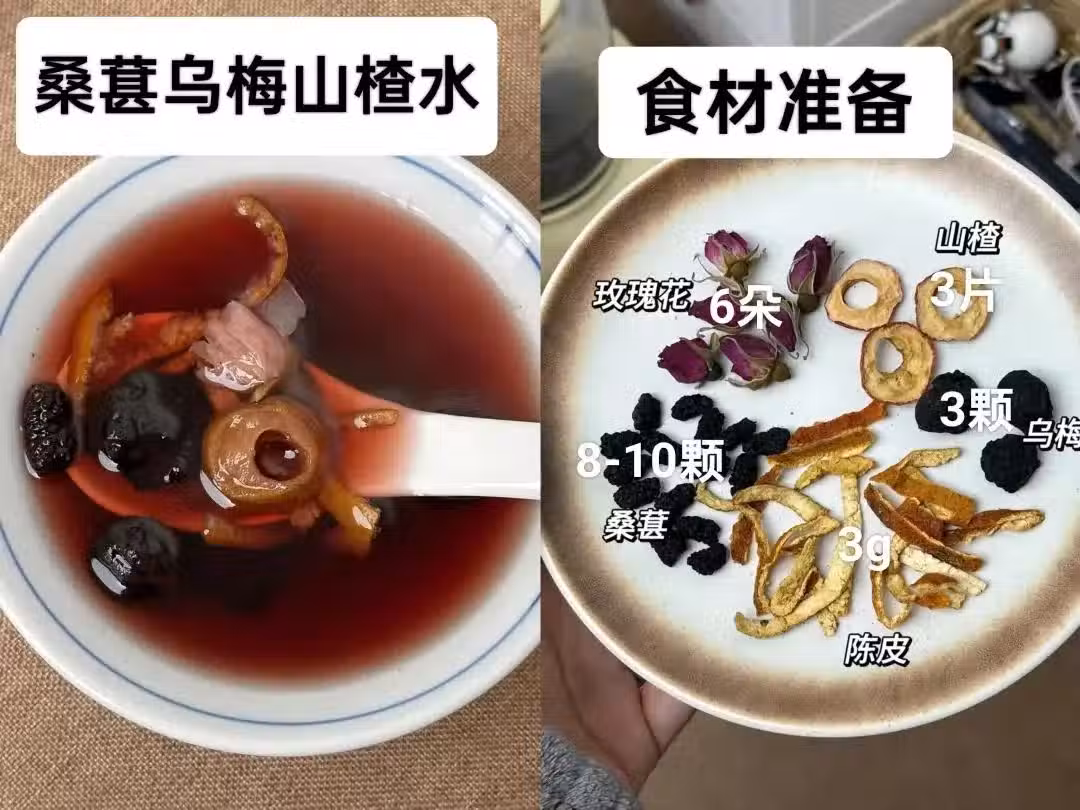 食材:桑葚干8-10粒、烏梅3顆、山楂3-4片、陳皮3g、玫瑰花6朵、冰糖適量