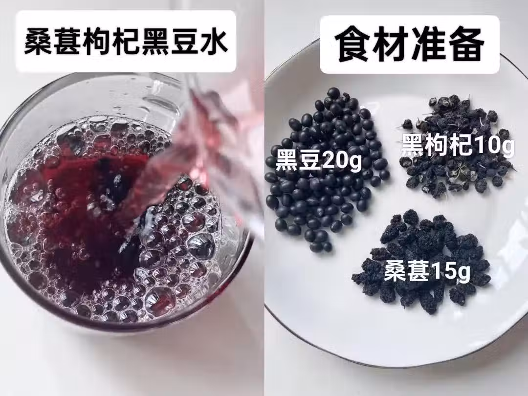 食材:桑葚干15g、黑豆20g、黑枸杞10g