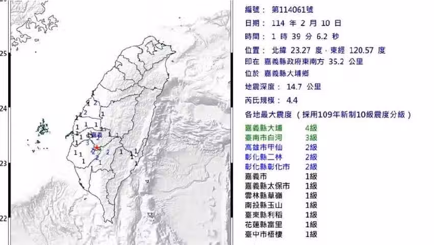 根據中央氣象署最新資訊,今(10)日凌晨1時39分發生芮氏規模4.4地震,地震深度14.7公里,震央位在嘉義縣政府東南方35.2公里(位在嘉義縣大埔鄉),最大震度嘉義縣4級。