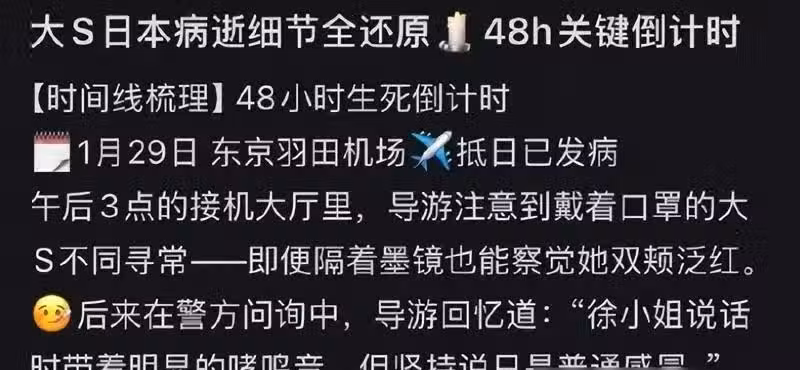 旅行過程中,大S的身體狀況早已開始亮起紅燈。知情人透露,在出發前,大S就出現了輕微的感冒症狀。但家人們並未引起足夠重視,甚至認為她只是「旅途疲勞」。到了日本後,天氣驟冷和連續奔波讓她的感冒逐漸加重,哮喘症狀也開始復發。然而,這樣的明顯信號,卻並未讓家人調整行程。