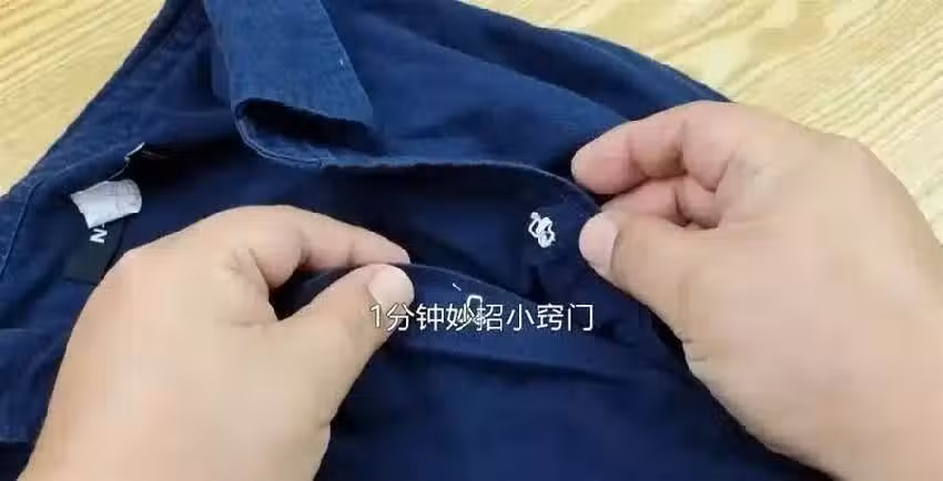我們只需使用針線將小掛鉤釘在襯衫領口處,注意不要完全縫合,僅需穿過襯衫單層即可。