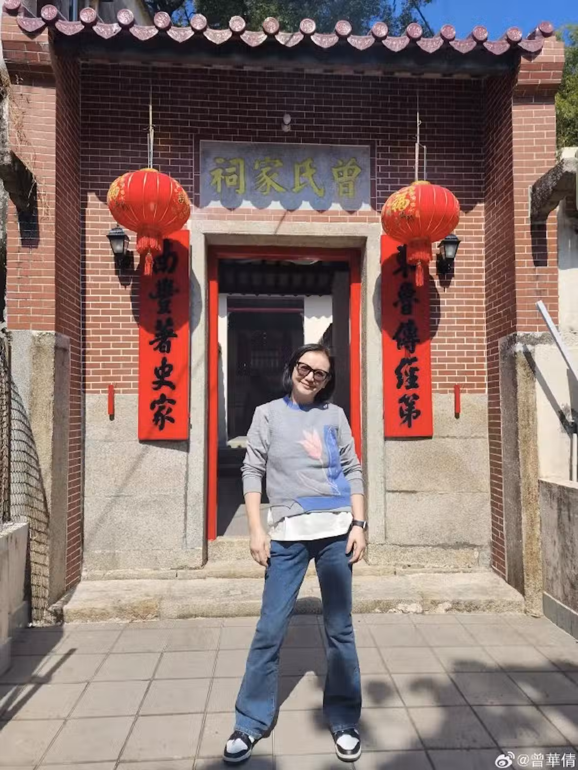 曾華倩此次回鄉祭祖,專程在曾氏家祠門前留影合照。從照片可見,曾氏家祠喜氣洋洋,在家祠的門前的兩側掛上了大紅燈籠。祠堂的門口的牆上還貼了紅色的堂聯,一邊寫著東魯傳經府,一邊寫著南豐修史家——這個堂聯是曾氏家族的淵源與遷徙史,是每個曾氏家族祠堂門口都有的堂聯。曾華倩在門口留影,只見她打扮休閒頗為樸素,戴著墨鏡,穿著牛仔褲,還有簡樸的長袖衫,笑容可掬。
