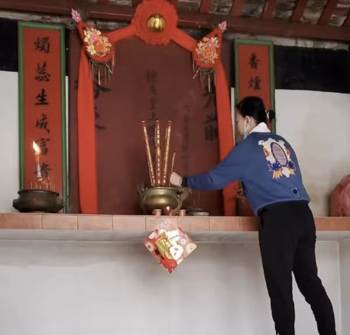 照片中曾華倩擼起了袖子,想必在此之前她也勞作了一番。回鄉祭祖並不是兩手空空,也不是到此一游。根據曾華倩以往回鄉祭祖的經驗,她要做的事情並不少,要在祠堂打掃衛生,還要進行各種儀式,包括到神位拜祭,在祖屋上香,到祠堂上香,其中祠堂的上香位置還比較高,還要攀高插香,少不了的要準備拜祭品,燒金銀衣紙,總之就是按照傳統的那一套進行,一點都不會馬虎。