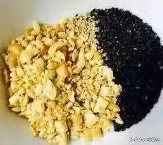 六十克花生米、五克黑芝麻、五克白芝麻用清水淘洗乾淨,瀝干水分後鋪在烤盤上,用150℃烤10分鐘,烤熟備用。