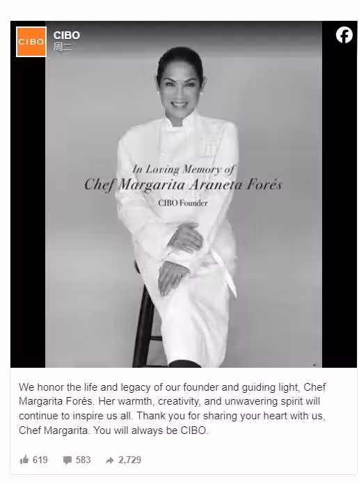 獲亞洲最佳女主廚頭銜的菲律賓名廚瑪格麗塔‧福爾斯(Margarita Forés)驚傳猝逝,人躺在飯店房間裡被發現,她的兒子也證實這則死訊。