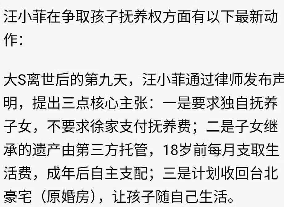 同時,他提出將子女繼承的遺產交由第三方託管,18歲前每月支取生活費,成年後自主支配,這既避免了徐家可能存在的「借撫養權掌控遺產」的質疑,也保障了孩子未來的經濟基礎。