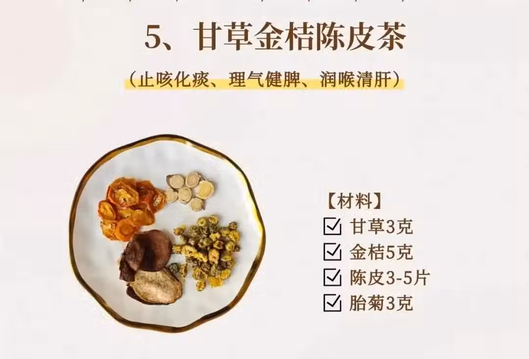 材料:甘草3克 | 金桔5克 | 陳皮3-5片 | 胎菊3克