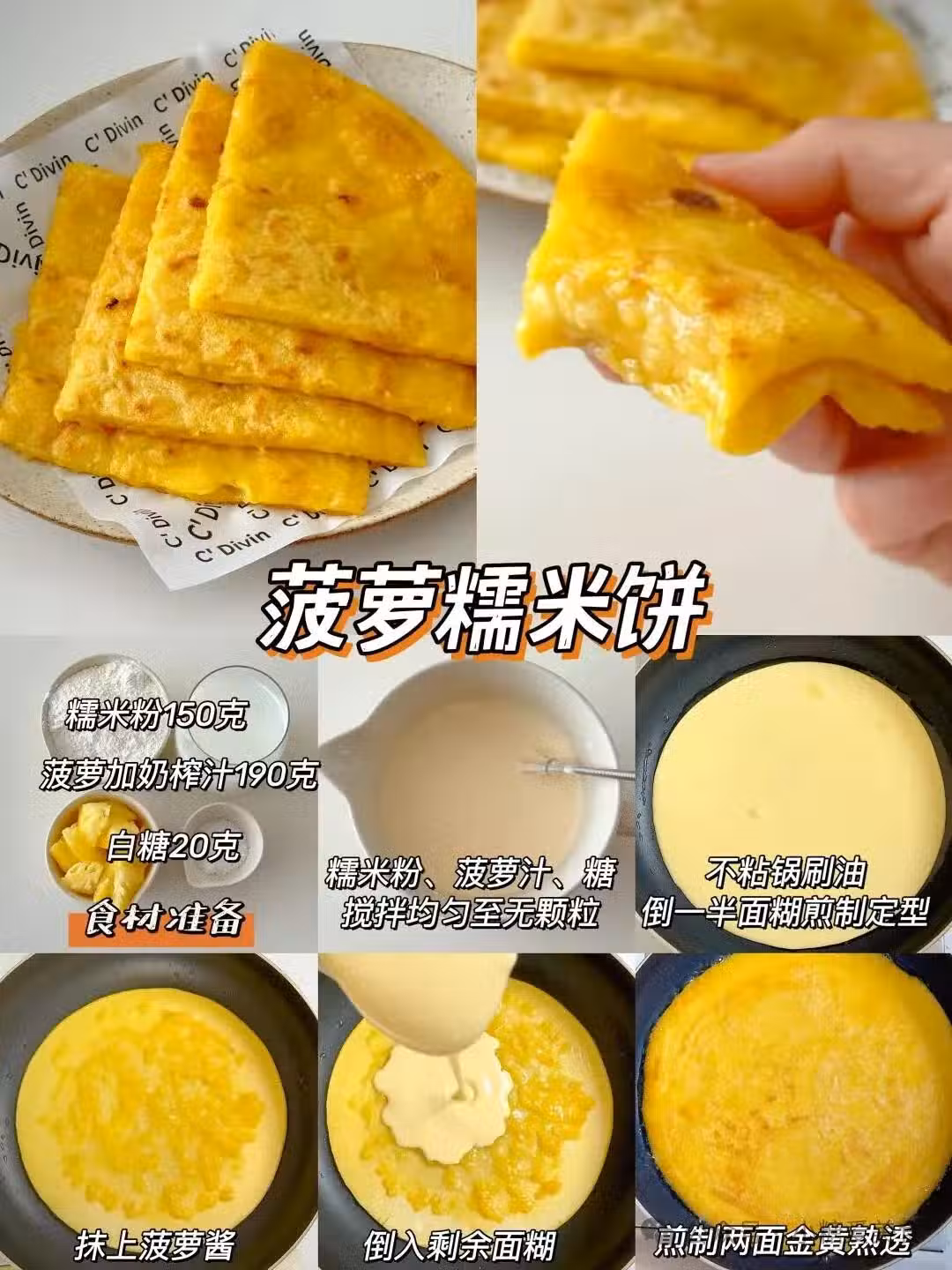 菠蘿切碎炒糖,包進糯米糰壓扁煎透。酸甜汁水浸透糯米,吃著像在嚼陽光!建議搭配《菠蘿菠蘿蜜》BGM,儀式感拉滿。