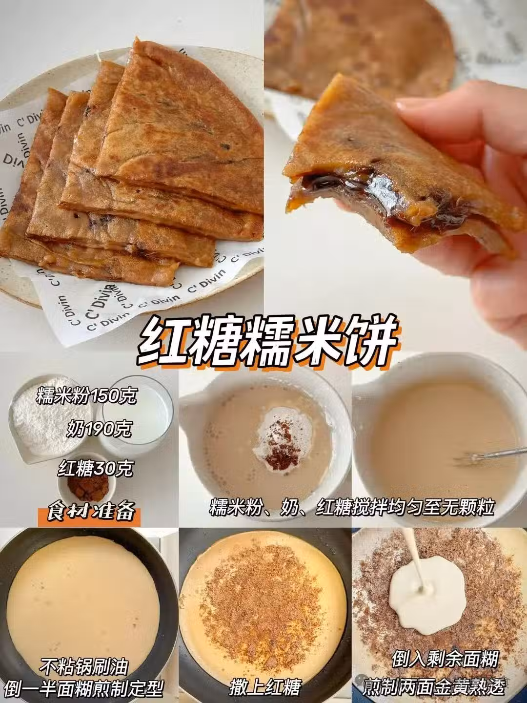 糯米皮包好下鍋煎。咬開糖汁燙嘴也要吸溜乾淨,甜到想起小時候偷吃灶台邊的年糕!冷吃更絕,紅糖凝固後嘎嘎香。