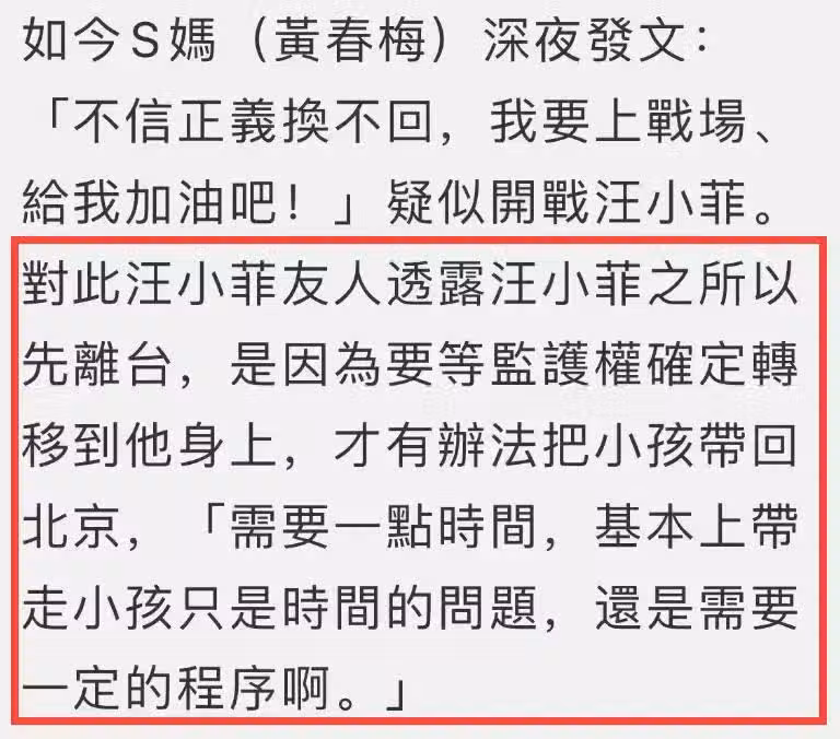 在S媽發文之後,汪小菲的朋友對外回應,稱汪小菲之所以先離台,是監護權還沒轉移到他身上,這需要一些時間,帶走兩個孩子基本上只是時間的問題。