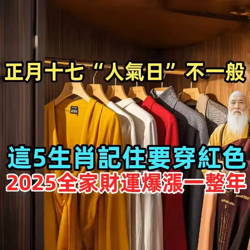 正月十七「人氣日」不一般,這5生肖記住要穿紅色,2025全家財運爆漲一整年! 正月十七,被稱為**「人氣日」,是一年當中極為重要的轉運時刻,影響著財運、人緣、貴人運**。 民間流傳:「人氣旺,財氣到」,這一天若能穿對顏色,特別是紅色,能夠激發自身氣場,吸引財運與貴人,讓整年好運不斷! 2025年,這5大生肖記住要穿紅色,助全家財運爆棚,旺到擋不住!看看有沒有你的生肖?