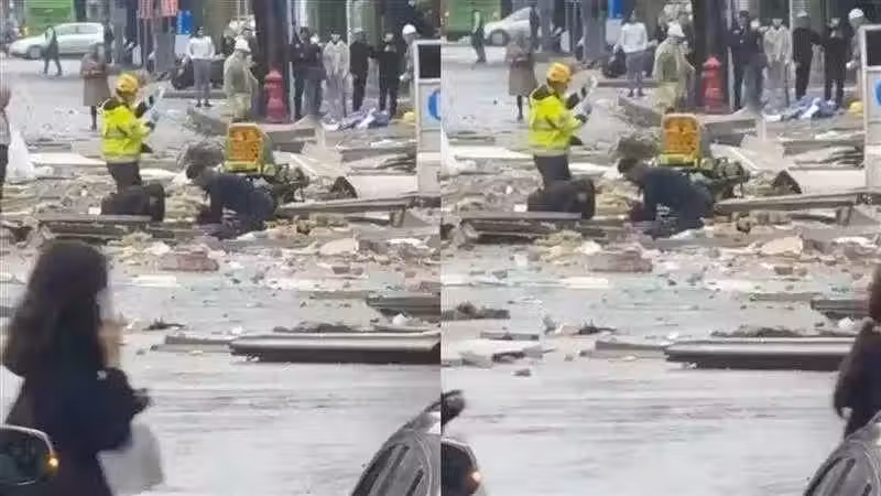 新光三越現場一片狼藉,網絡上陸續有網友分享現場畫面,其中一位網友目擊,馬路上因為氣爆,整條道路都是被炸飛的碎片以及窗戶玻璃,結果一位疑似警消人員,不顧地上被炸飛的玻璃碎屑,正在馬路上協助患者CPR,讓眾人為此祈禱「一切平安」。
