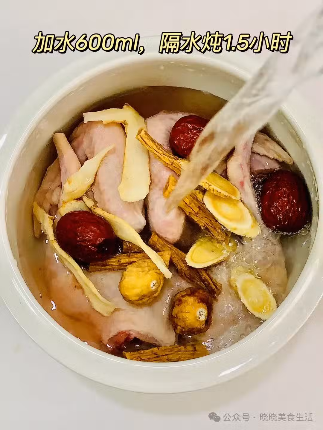③我們將除枸杞外的所有食材一同放入燉盅內,並額外加入三片生薑以提升風味。隨後,向燉盅中注入600毫升的開水,並立即開始燉煮過程,時長為1.5小時。在此過程中,使用開水可以顯著加快燉湯的速度,並有效減少營養成分的流失。同時,為了確保燉湯的品質,我們應避免在燉煮過程中打開蓋子或額外添加水分。
