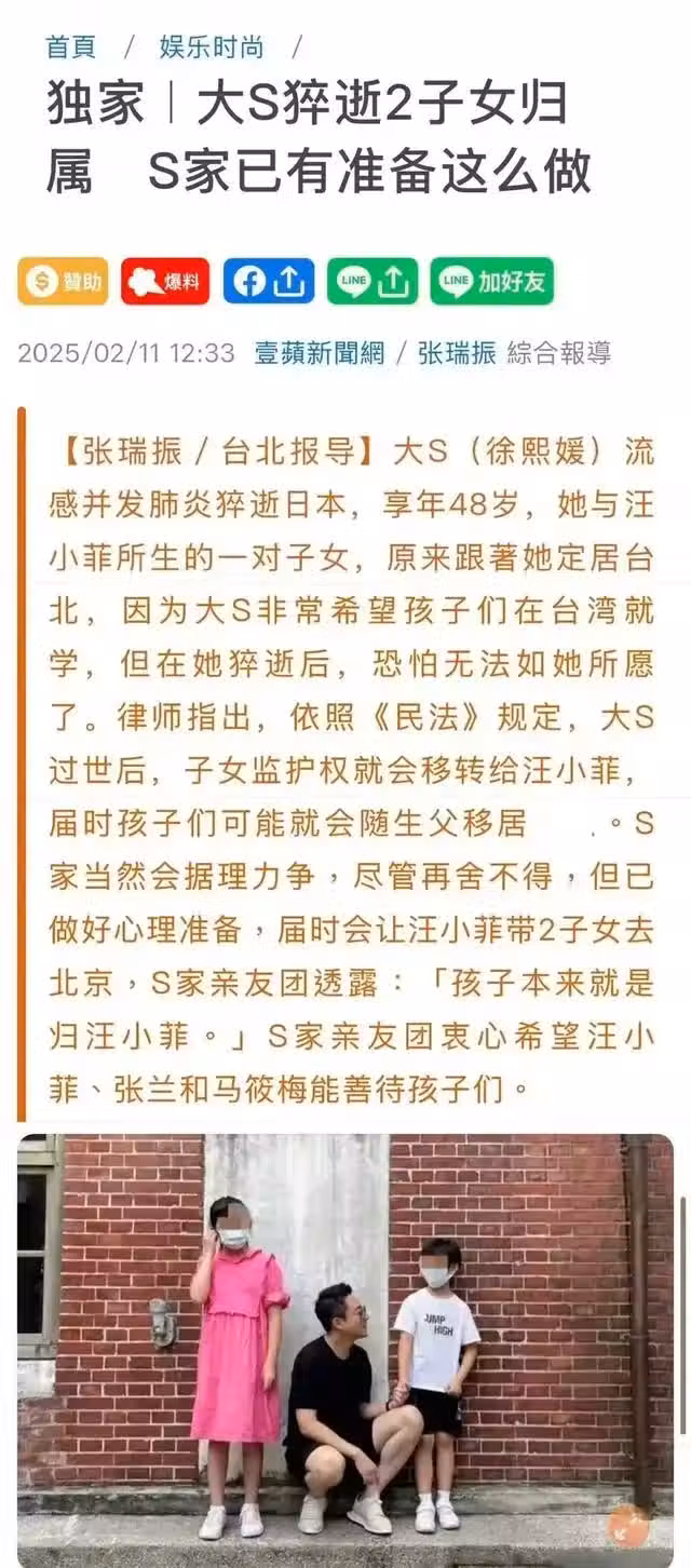 2月11日,就在大S去世後的第10天,台媒報道說兩個孩子的撫養權已移交給了汪小菲。