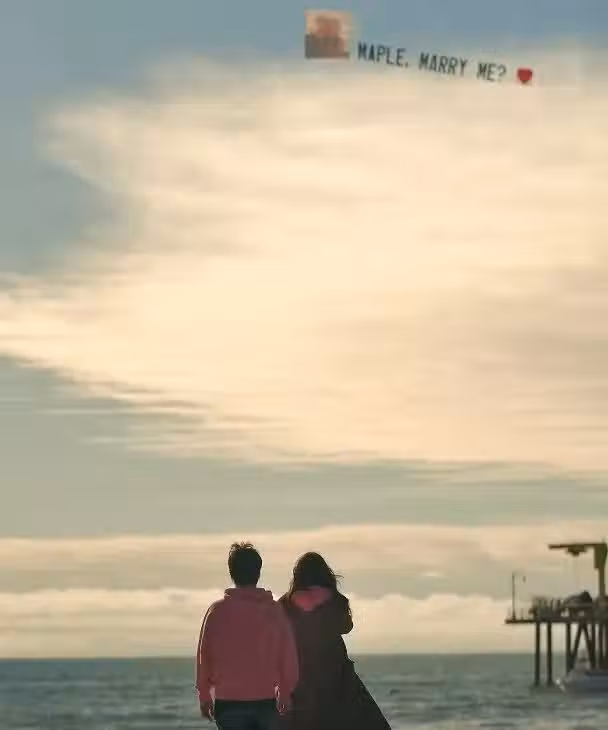 兩人背影照非常甜蜜,天空的角落還用英文印著「Maple, merry me?(你願意嫁給我嗎)」